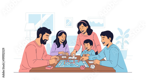 Счастливая семья, играющая в настольную игру, векторный значок, изолированный на белом фоне