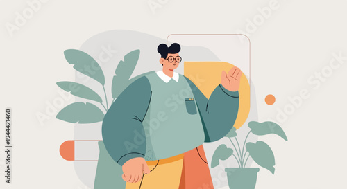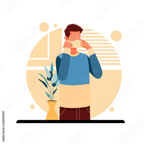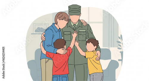 Счастливый муж и отец, обнимающий свою жену и сына, плоская векторная иллюстрация. Солдат, военнослужащий возвращается домой. Семейные отношения. Домашний интерьер. Возвращение на родину.