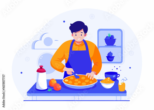 Счастливый отец готовит блины с дочерью на кухне, плоская векторная иллюстрация. Папа с ребенком проводят время вместе, готовя завтрак. Отношения между родителями и детьми, счастливое отцовство и воспитание детей.