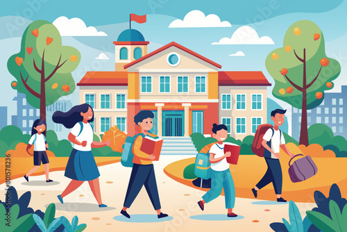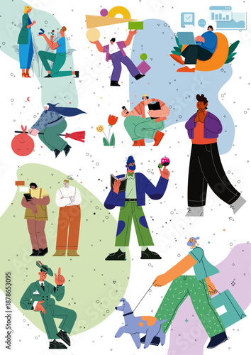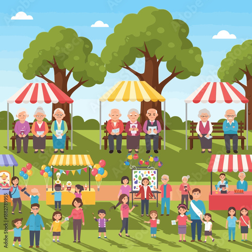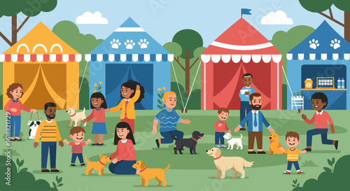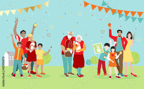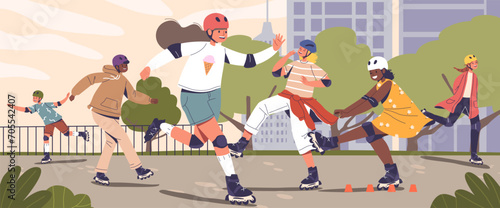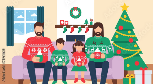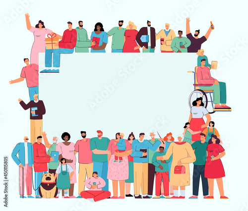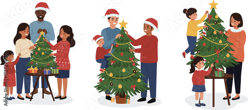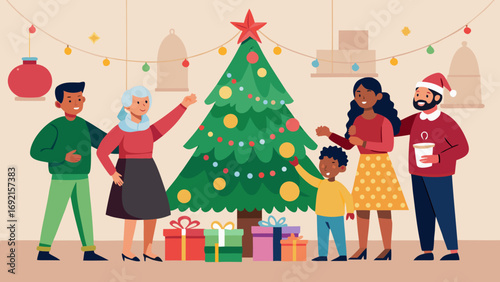 Счастливые друзья стоят за рождественской елкой на улице города, позируя для групповой фотографии. Празднование Нового года на открытом воздухе векторная иллюстрация