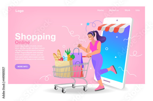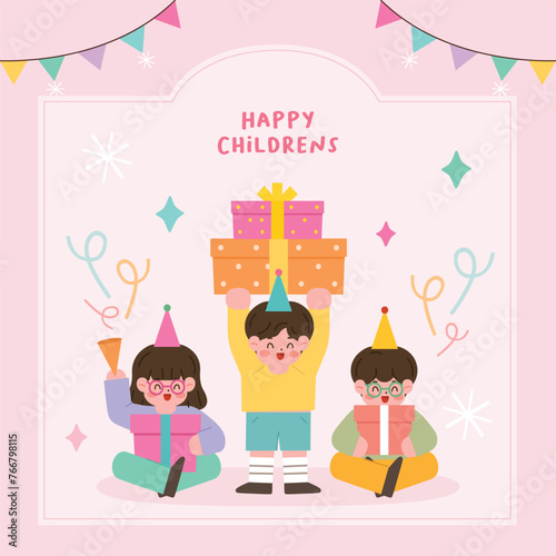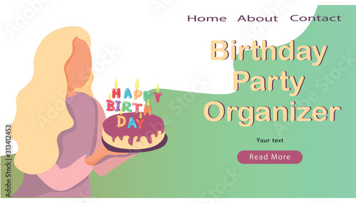 Счастливая девушка дует свечи на свой праздничный торт и наслаждается своими подарками. День рождения векторная концепция иллюстрации. Женщина развешивает бумажные гирлянды, готовясь к празднованию дня рождения. Дизайн веб-сайта.