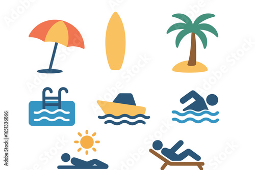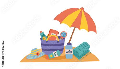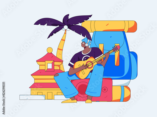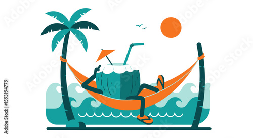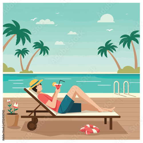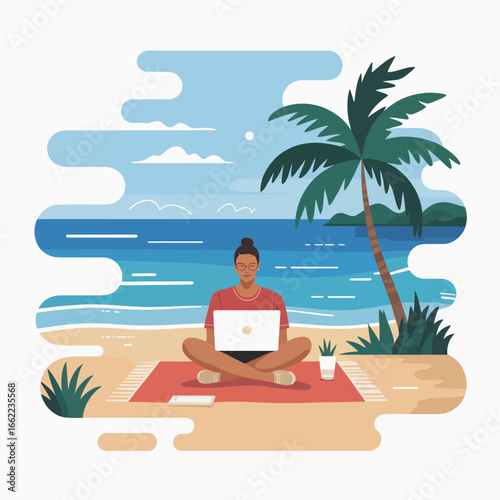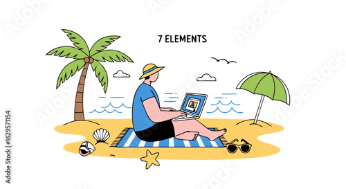 Счастливая девушка, фрилансер, работающий на портативном компьютере, сидя на шезлонге на пляже, плоская векторная иллюстрация. Фриланс, отдых, удаленная работа на свежем воздухе, летние каникулы.