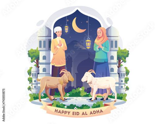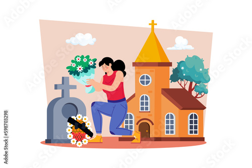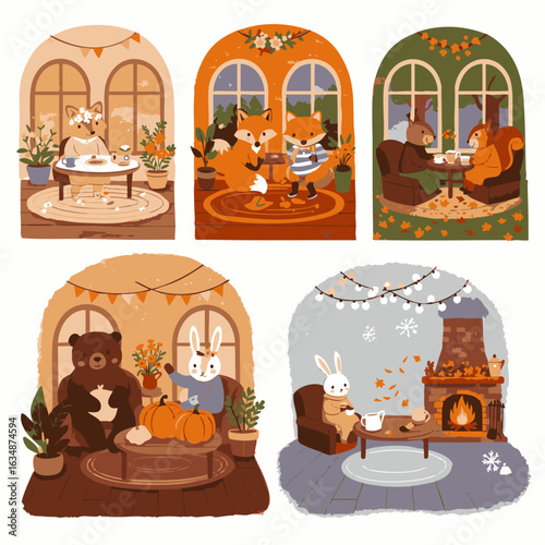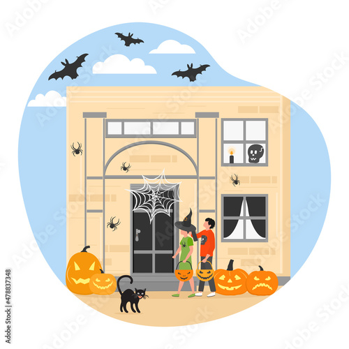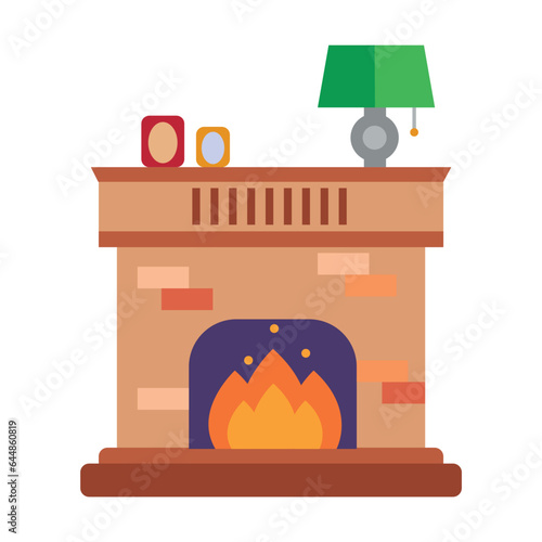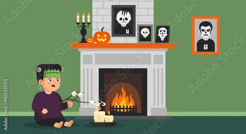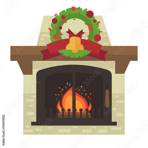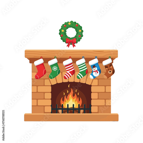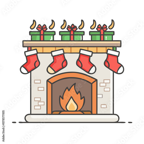 Счастливая девушка кладет подарочную коробку в рождественский носок, плоская векторная иллюстрация. Украшенный камин рождественским венком, носками, гирляндой и подарками. Подготовка к празднованию Рождества, Нового года и зимних праздников