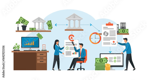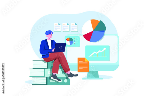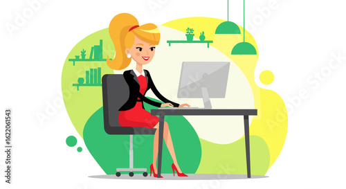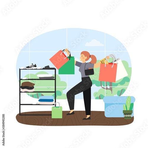 Молодая женщина наслаждается шопингом. Счастливая девушка с кучей хозяйственных сумок в модном бутике, плоская векторная иллюстрация. Бизнес розничного магазина женской одежды.
