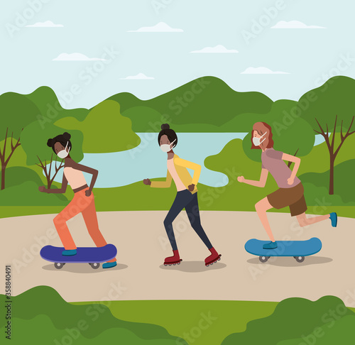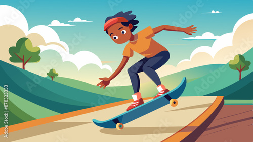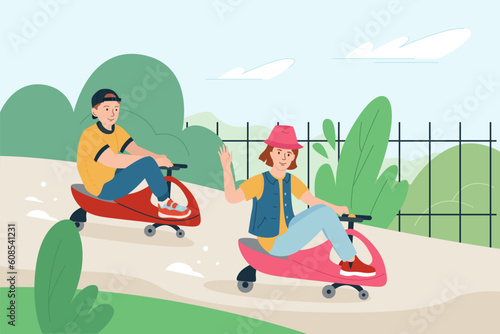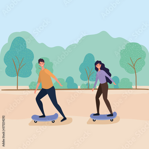 Счастливые девушка и парень-подростки катаются на скейтборде по шоссе. Молодая пара хипстеров занимается фристайлом на открытом воздухе векторная иллюстрация
