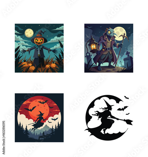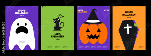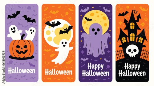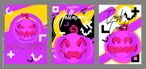 Набор поздравительных открыток с приглашением на вечеринку в честь Хэллоуина, векторная иллюстрация в стиле бумажного искусства. Вырезанные из бумаги традиционные символы Хэллоуина - страшная тыква, дом с привидениями, летающие летучие мыши, кладбище, мертвое дерево.