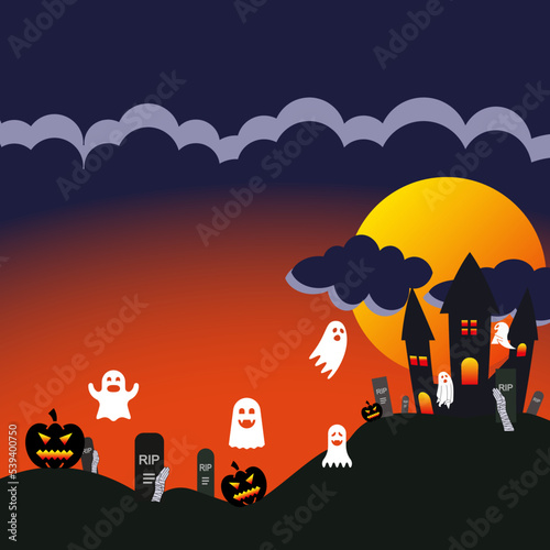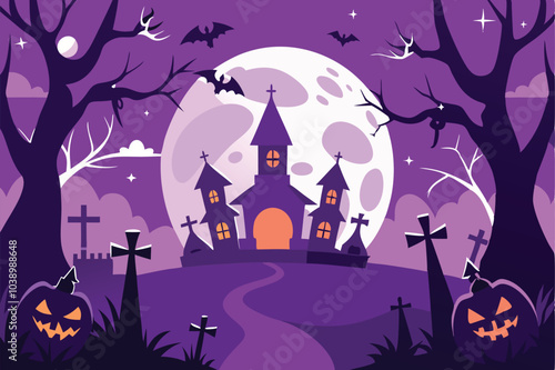 Счастливого празднования вечеринки в честь Хэллоуина, плоская векторная иллюстрация. Люди празднуют Хэллоуин с летучими мышами, тыквой, глазными яблоками, свечами, конфетной кукурузой, символами праздника ведьм.