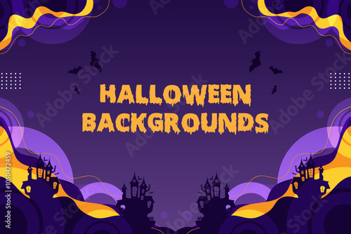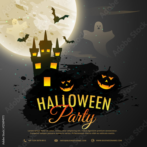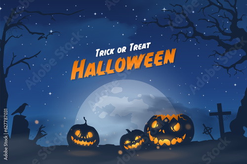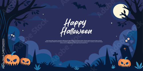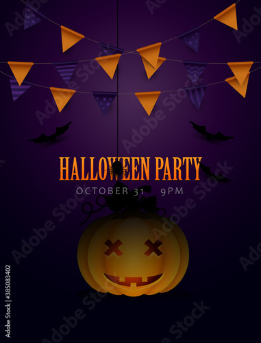 Счастливое приглашение на вечеринку в честь Хэллоуина, векторная иллюстрация в стиле бумажного искусства. Ночной фон с полумесяцем, страшной тыквой, домом с привидениями, летающими летучими мышами, кладбищем с могилами и мертвым деревом.