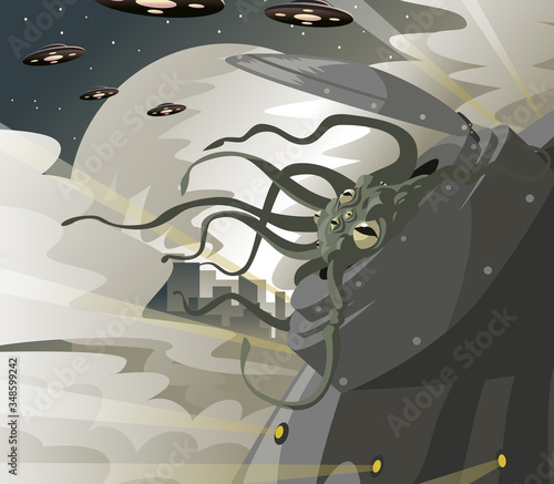 Ночной фон с полной луной, домом с привидениями, летающими летучими мышами, мертвым деревом и пауком, векторная иллюстрация в стиле бумажного искусства. Композиция "Счастливый Хэллоуин" для приглашения на вечеринку, плаката, поздравительной открытки.