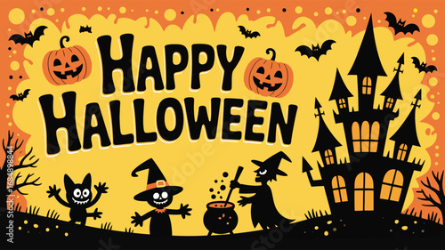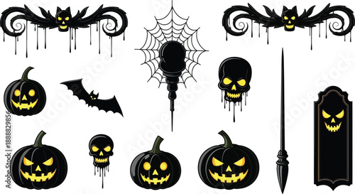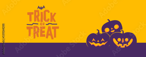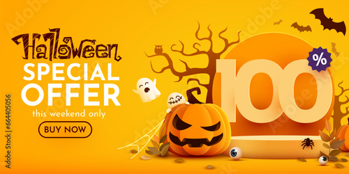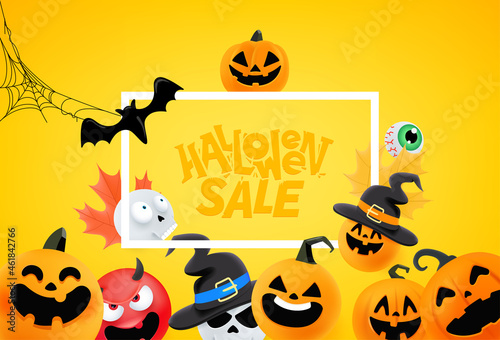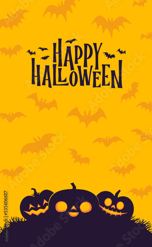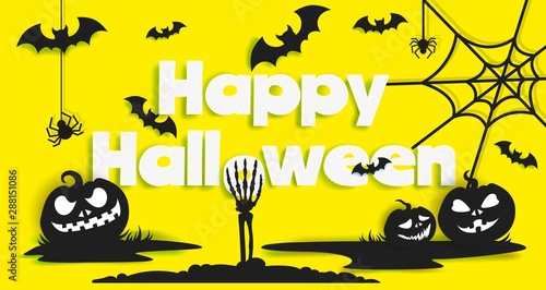 Шаблон баннера с плакатом Happy Halloween, векторная иллюстрация в стиле бумажного искусства. Черные страшные тыквы, летающие летучие мыши, паук, силуэты паутины на желтом фоне.