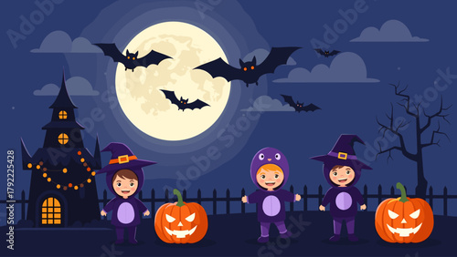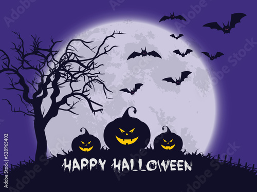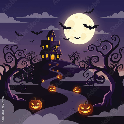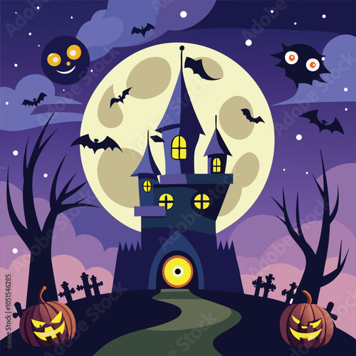 Ночной фон с полной луной, страшная тыква, дом с привидениями, летающие летучие мыши, кладбище с могилами, мертвое дерево, векторная иллюстрация в стиле бумажного искусства. Композиция на Хэллоуин для приглашения на вечеринку, плакат.