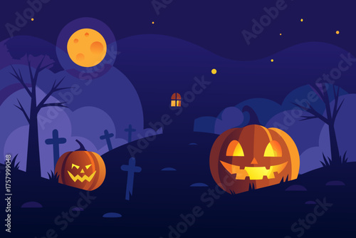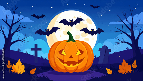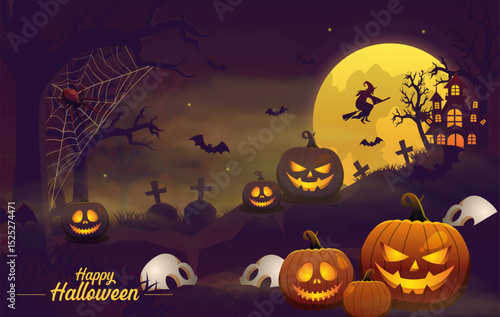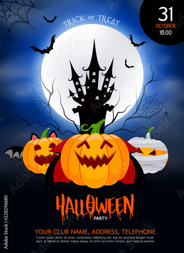 Шаблон плаката с днем Хэллоуина, векторная иллюстрация в стиле современного ремесла из бумаги. Ночной звездный фон и традиционные символы Хэллоуина - полная луна, страшная тыква, дом с привидениями, летающие летучие мыши.