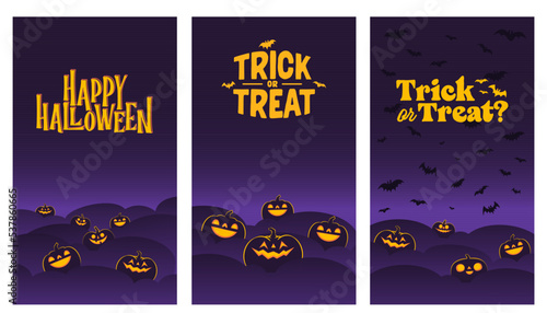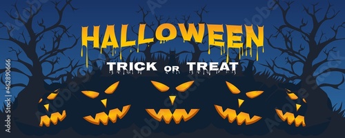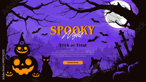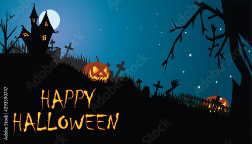 Шаблон плаката Happy Halloween, векторная иллюстрация в стиле бумажного искусства. Традиционные символы Хэллоуина - полная луна, страшная тыква, дом с привидениями, летающие летучие мыши, кладбище с могилами, мертвое дерево.