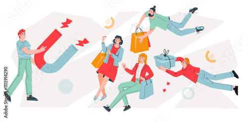 Кошка, сидящая на огромном призраке, летающие летучие мыши и счастливые персонажи мужского и женского пола, векторная иллюстрация. Концепция счастливого Хэллоуина для веб-баннера, страницы веб-сайта и т.д.