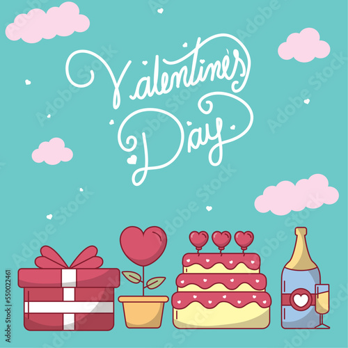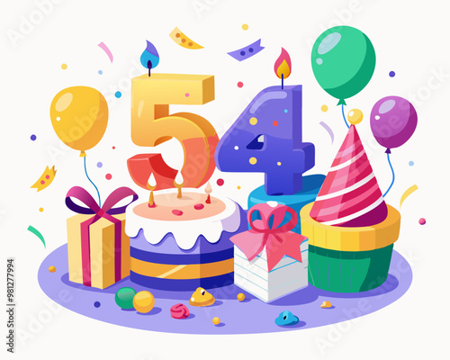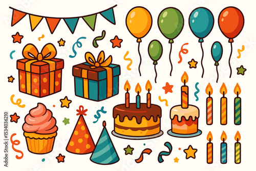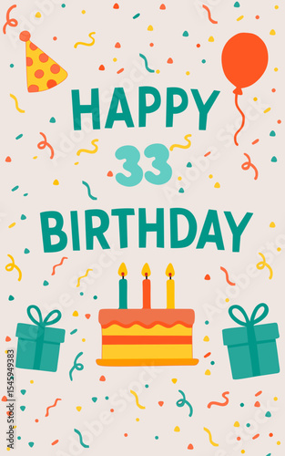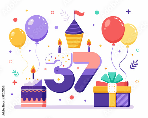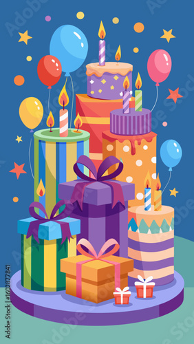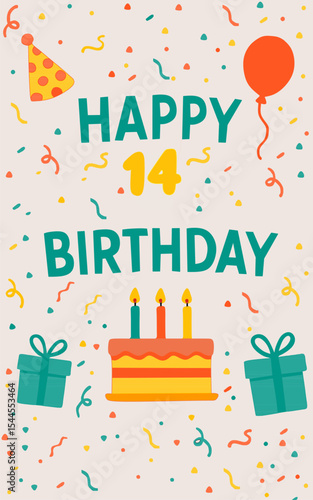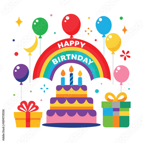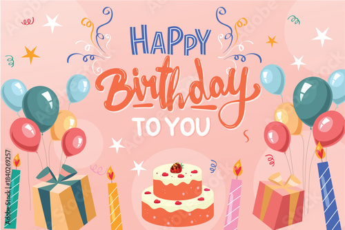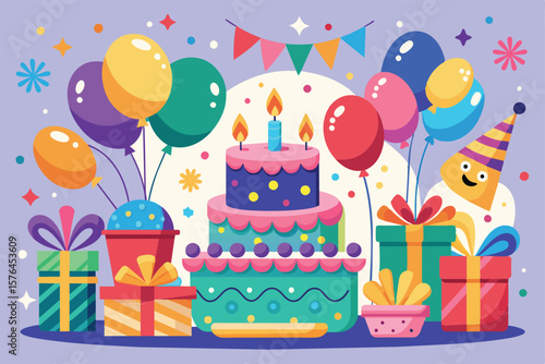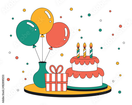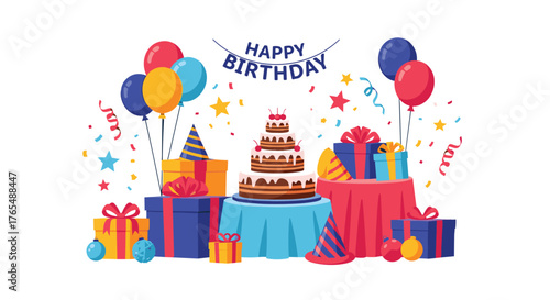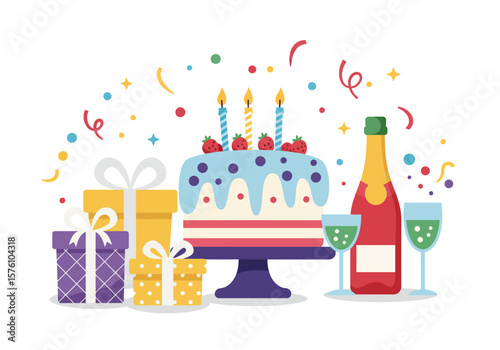 Векторная плоская иллюстрация счастливых праздников. Праздничный торт и шляпы, вино, подарочные коробки, воздушные шары, долларовые монеты и конфетти. Поздравительная открытка, праздничный плакат, баннер.