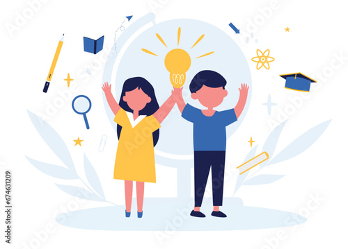 Вектор счастливых детей-победителей. Иллюстрация маленького мальчика и девочки, празднующих победу. Веселые школьники стоят с кубком. Взволнованные милые дети получают первую награду gold trophy