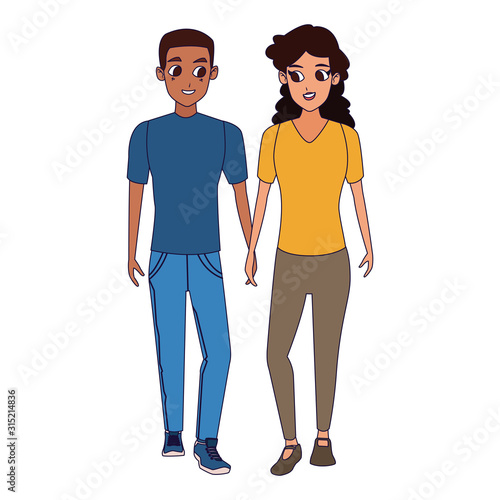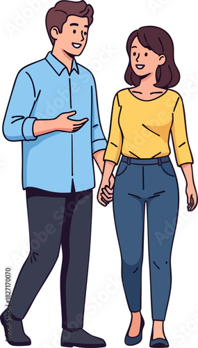 Счастливая любящая пара, держась за руки, прогуливается вместе векторная иконка, изолированная на белом фоне.