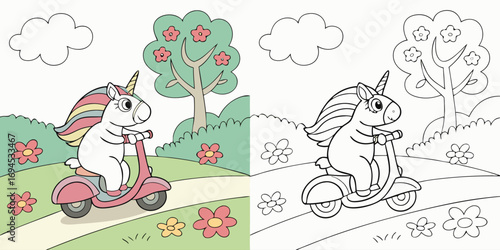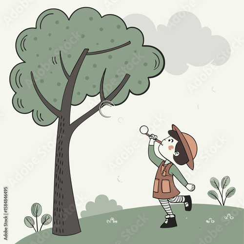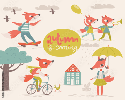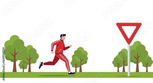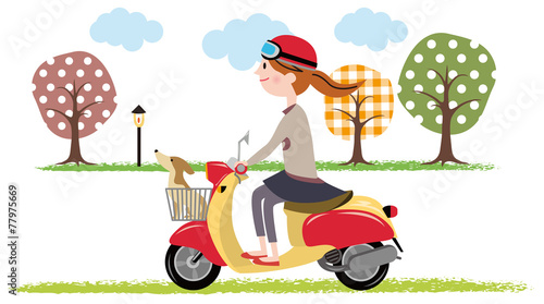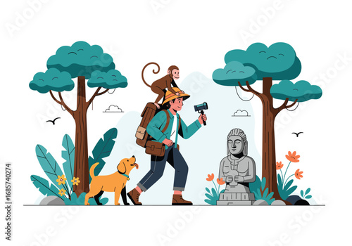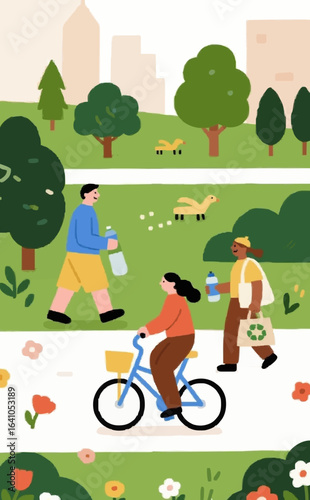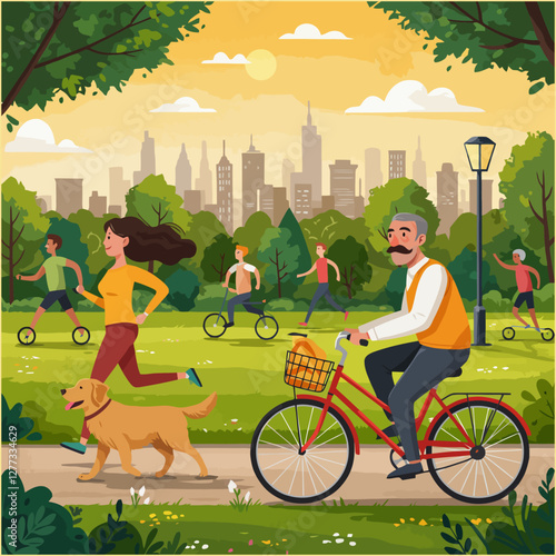 Счастливые персонажи мужского пола едут на велосипеде и выгуливают любимую собаку в городском парке, векторная плоская иллюстрация. Активный и здоровый образ жизни, летние мероприятия на свежем воздухе.