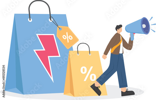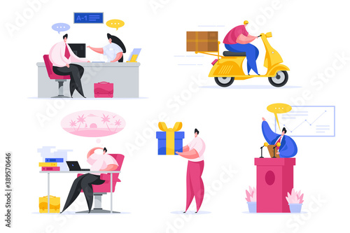 Огромная подарочная коробка и автомобиль с лентами, счастливый человек, счастливый обладатель приза с подарочной коробкой, плоская векторная иллюстрация. Розыгрыш, победитель лотерейной игры, концепция розыгрыша призов.