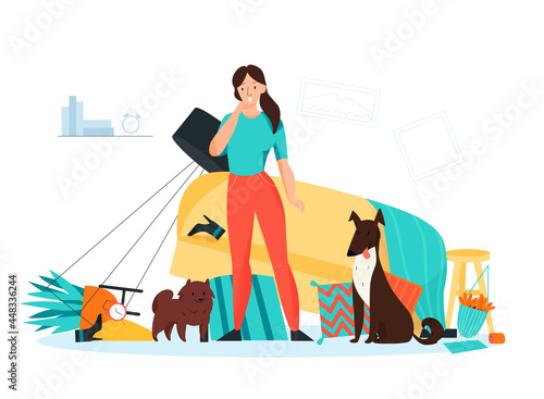 Счастливая мать играет с сыном и домашней собакой дома, плоская векторная иллюстрация. Мама и ребенок проводят время вместе. Отношения между родителями и детьми, счастливое материнство и воспитание детей.