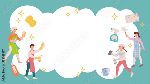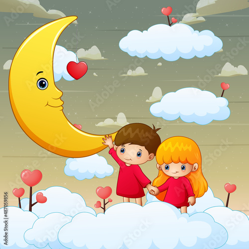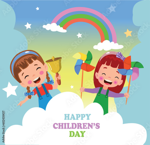 Счастливая мать с двумя детьми, идущая по пушистым облакам и держащая зонтик, векторная иллюстрация в стиле бумажного искусства. Шаблон поздравительной открытки с Днем матери.