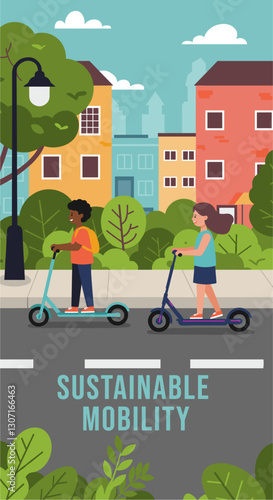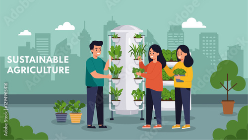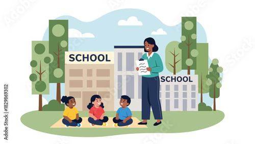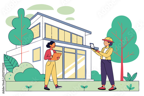 Счастливая многорасовая семья в саду рядом с большим современным домом с гаражом, плоская векторная иллюстрация. Родители с ребенком во дворе перед домом. Семейный домашний плакат, шаблон баннера.
