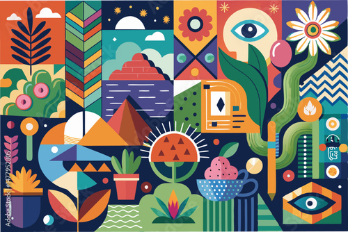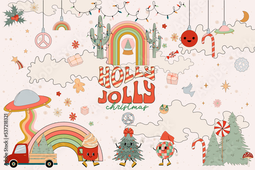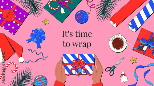 Поздравительный баннер или плакат с новым годом поверх праздничного бесшовного узора с красочными праздничными аксессуарами и сладостями в векторном дизайне иллюстрации