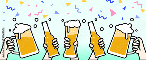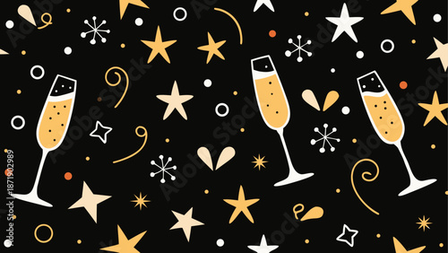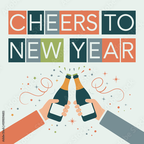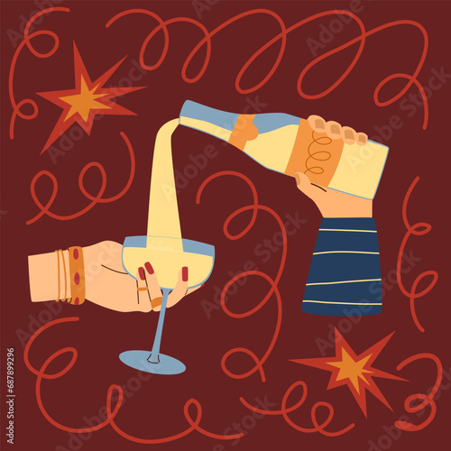 Поздравительная открытка с Новым годом с человеческими руками, держащими бокалы с шампанским, фейерверки и бенгальские огни на фоне праздничной векторной иллюстрации