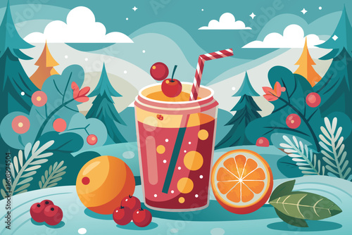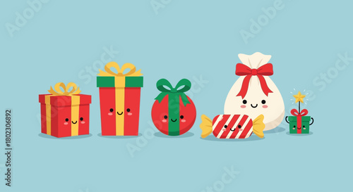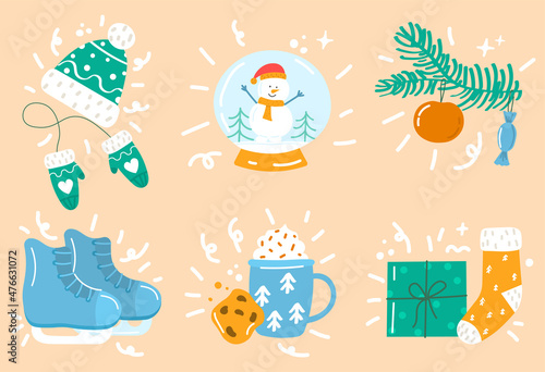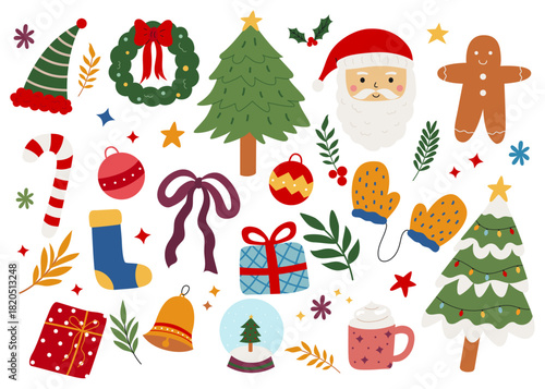 С Новым годом векторная иллюстрация дизайна в плоском стиле. Шляпа Санты, подарочные коробки, стакан молока с печеньем, леденцы, рождественская елка, шары. Композиция для зимних праздников для веб-баннера, страницы сайта и т.Д