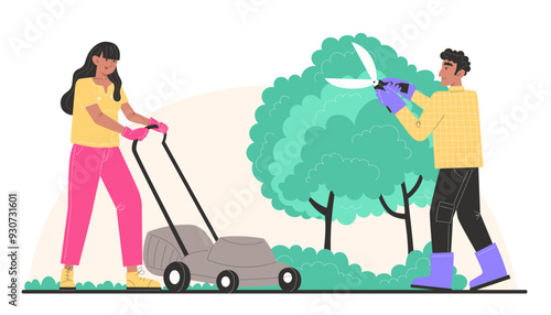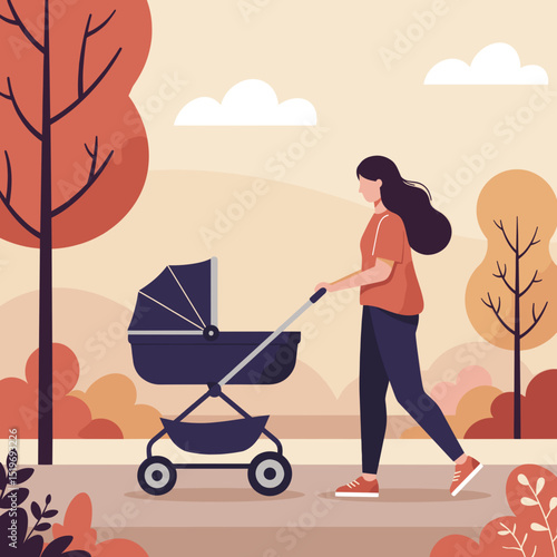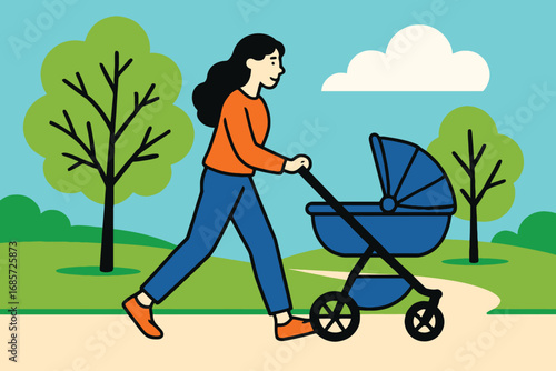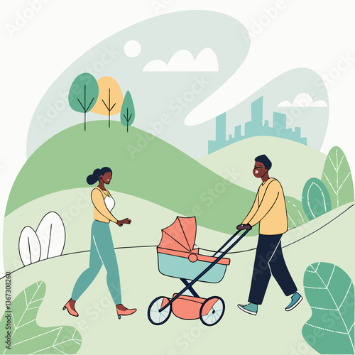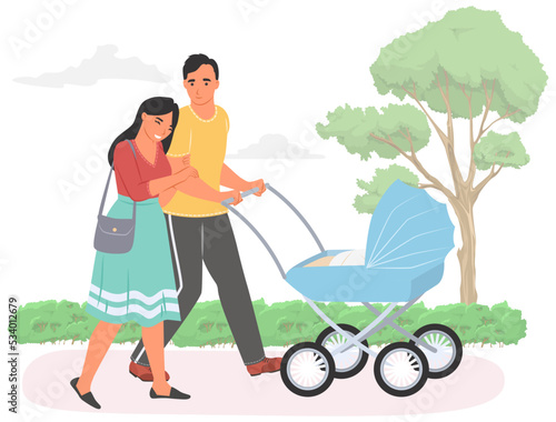 Счастливый родитель, выгуливающий ребенка в коляске векторная иллюстрация. Молодые отец и мать-героини с новорожденным в парке. Уход за детьми и родительские обязанности, семья и сближение