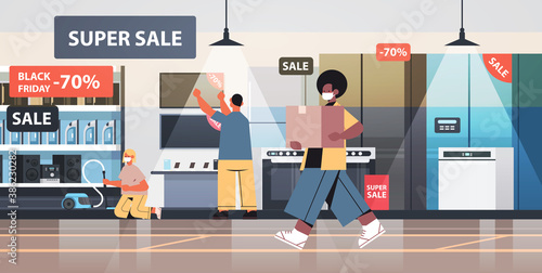 Счастливые люди покупают подарки в торговом центре, плоская векторная иллюстрация. Мужские и женские персонажи ходят по магазинам, готовясь к празднованию Нового года и рождественских праздников.