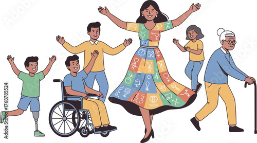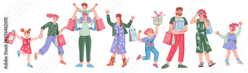 Люди празднуют рождественскую вечеринку, плоская векторная изолированная иллюстрация. Семейные персонажи, взрослые и дети, коллеги, друзья танцуют и веселятся. Празднование зимних праздников.