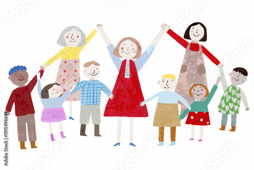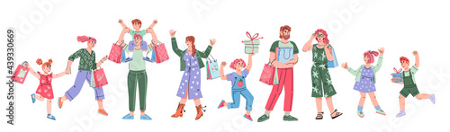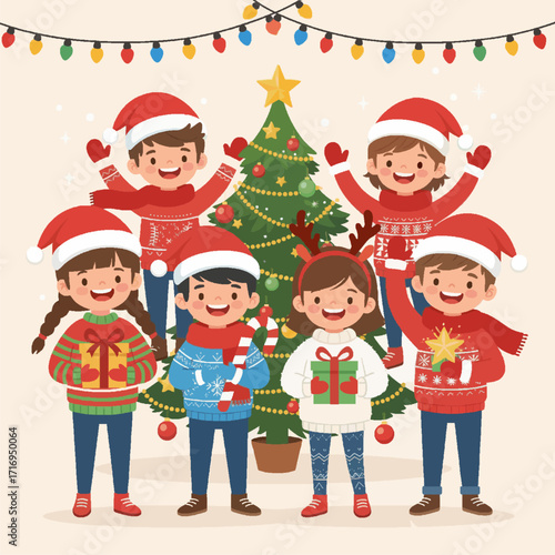 Люди празднуют рождественскую вечеринку, плоская векторная изолированная иллюстрация. Семейные персонажи, взрослые и дети, коллеги, друзья танцуют и веселятся. Празднование зимних праздников.