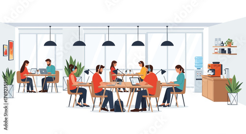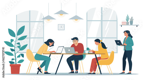 Счастливые люди празднуют Пасху дома, плоская векторная иллюстрация. Семейные персонажи встречают гостей. Празднование весеннего праздника с друзьями и традиционным пасхальным куличом и крашеными яйцами.
