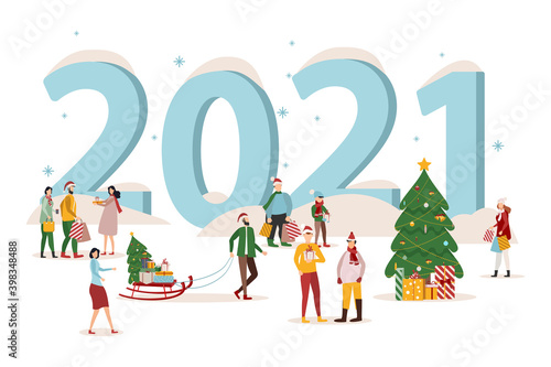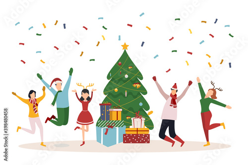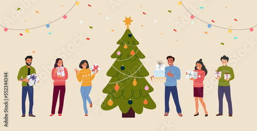 Счастливые люди празднуют праздник и украшают рождественскую елку. Мужчина и женщина празднуют и веселятся с друзьями. Новогодняя и рождественская вечеринка. Векторный баннер.