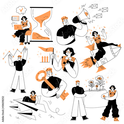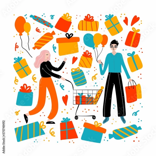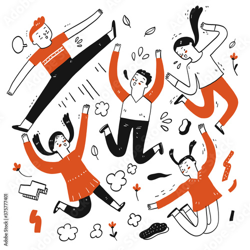 Счастливые люди, друзья, празднуют векторную иллюстрацию праздничного события. Молодые мужчина и женщина пьют коктейли, танцуют и разговаривают вместе, испытывая радость и веселье