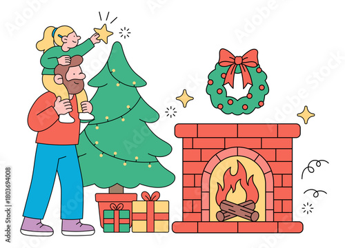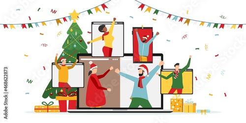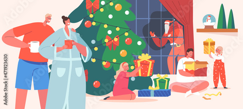 Крошечные персонажи мужского и женского пола готовят традиционные рождественские подарки, плоская векторная иллюстрация. Счастливые люди упаковывают подарочные коробки, имбирное печенье, леденцы в гигантский рождественский носок.