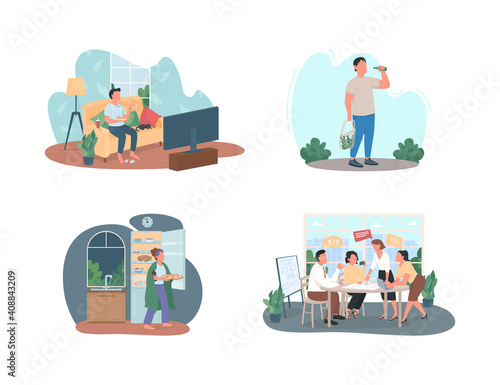 Счастливые люди, отправляющие и получающие подарки, плоская векторная иллюстрация. Свежие цветы, пицца, подарочная коробка. День рождения, годовщина, романтические подарки. Онлайн-служба доставки подарков.