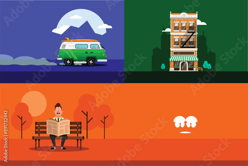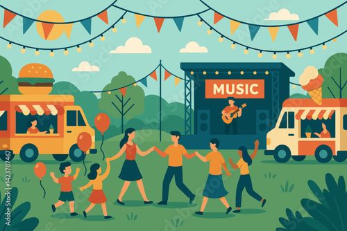 Счастливые люди, отдыхающие в городском парке, плоская векторная иллюстрация. Персонажи мужского и женского пола устраивают пикник, едят мясо на гриле и уличную еду. Вечеринка с барбекю, летний лагерь, выходные, отдых на свежем воздухе.