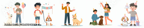 Счастливые люди-победители, плоская векторная изолированная иллюстрация. Дети и взрослые, владельцы домашних собак празднуют победу, держа в руках призы, трофейные кубки, прыгая и веселясь.