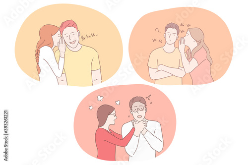 Счастливые владельцы домашних животных, любящие очаровательного щенка и котенка, плоская векторная иллюстрация. Улыбающиеся девочка и мальчик обнимают собаку и кошку. Владение домашними животными, забота о домашних животных, любовь.
