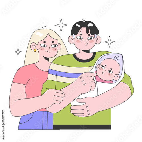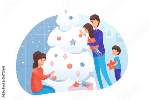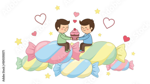 Счастливые владельцы домашних животных с милым щенком и котенком, плоская векторная иллюстрация. Улыбающиеся девочка и мальчик гладят собаку и кошку. Владение домашними животными, забота о домашних животных и любовь.