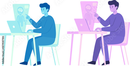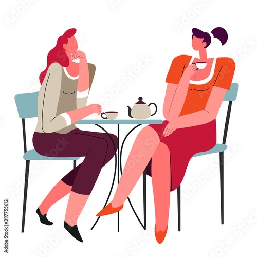 Счастливые молодые люди сидят за столом, пьют кофе на ходу и разговаривают друг с другом, плоская векторная иллюстрация. Романтическая пара, проводящая время вместе. Перерыв на кофе. Любовь. Отношение.
