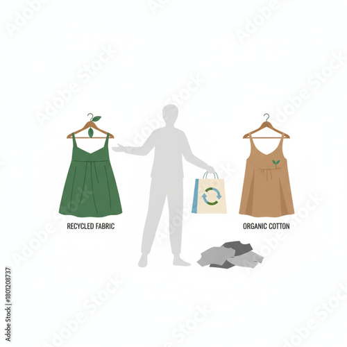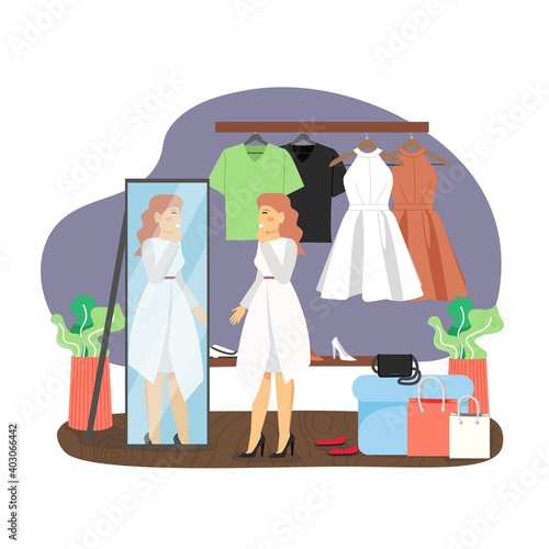 Счастливая женщина покупает платье в магазине женской одежды, плоская векторная иллюстрация. Симпатичная девушка держит летнее красное платье на вешалке. Интерьер модного бутика.