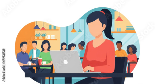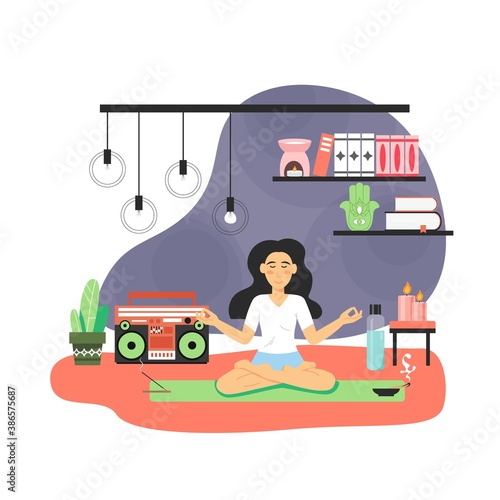 Счастливая женщина, проводящая время дома. Симпатичная девушка занимается йогой, сидя в позе лотоса, наслаждаясь медитацией, плоская векторная иллюстрация. Домашний фитнес, ежедневные тренировки, женская йога, здоровый образ жизни