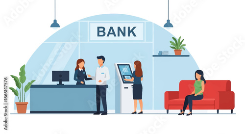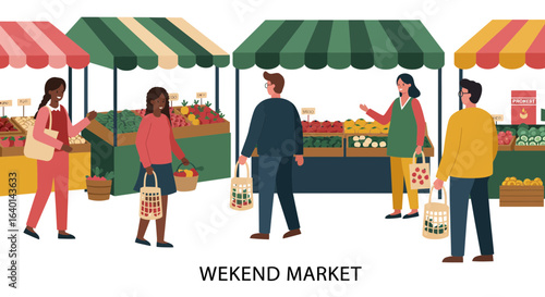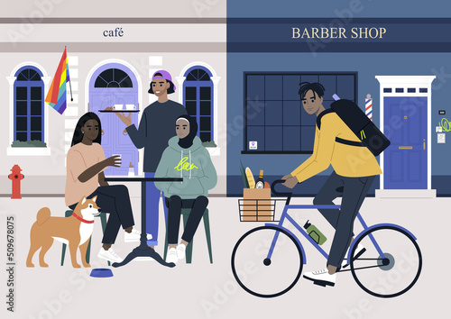 Счастливые женщины за покупками, плоская векторная иллюстрация. Здание магазина. Красивые дамы несут хозяйственные сумки с покупками.