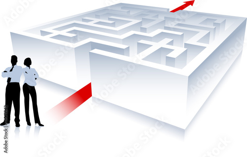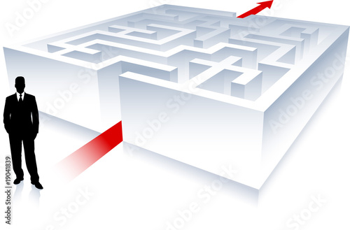 Трудный путь к финансовому успеху векторная иллюстрация с бизнесменом в строгом костюме, держащим портфель, стоящим рядом со входом в лабиринт