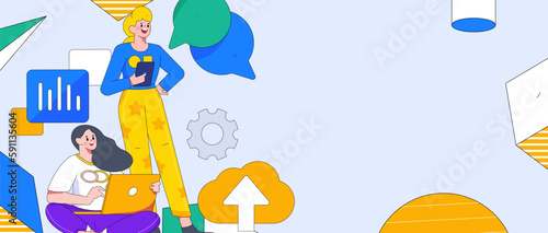 Символ хэштега и зависимая от социальных сетей женщина в смартфоне, плоская векторная иллюстрация. Зависимость от социальных сетей.