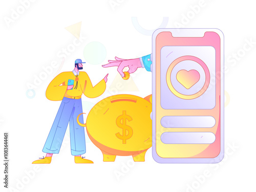 Символ хэштега и зависимая от социальных сетей женщина в смартфоне, плоская векторная иллюстрация. Зависимость от социальных сетей.