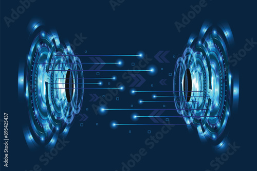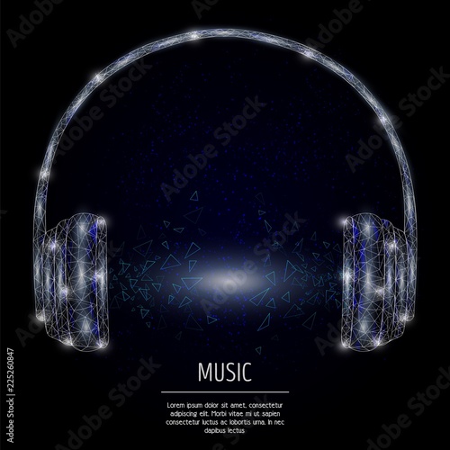 Векторные наушники в стиле полигонального искусства. Низкополигональная каркасная сетка с рассеянными частицами и световыми эффектами на темно-синем фоне. Шаблон дизайна баннера музыкального концептуального плаката с пространством для копирования.